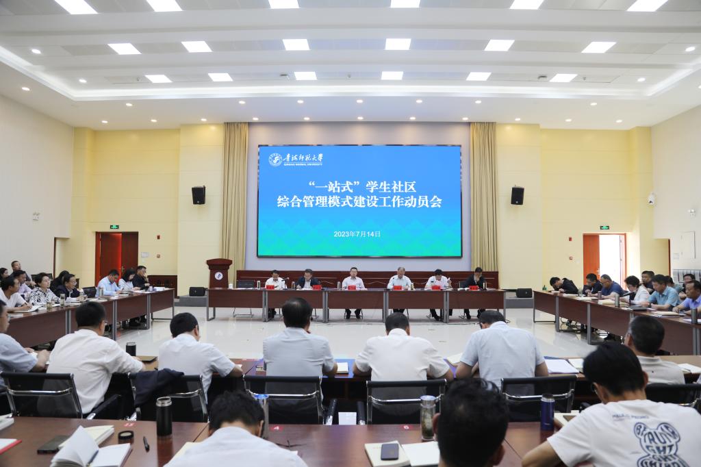 “一站式”学生社区综合管理模式建设工作是深入学习贯彻习近平总书记关于教育的重要论述,适应新形势新情况、加强高校党的建设和思想政治工作的重要体制创新。经过前期调研、建设,我校已具备“一站式”学生社区综合管理模式建设的各项条件。7月14日,学校召开“一站式”学生社区综合管理模式建设动员部署会,全体校领导、处级领导干部、专职辅导员参加,会议由校党委副书记许存宁主持。